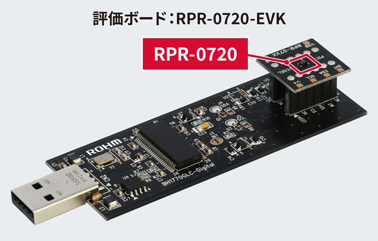 ロームでは、小型近接センサ「RPR-0720」をすぐに評価していただくために、評価ボード「RPR-0720-EVK」も提供しています。