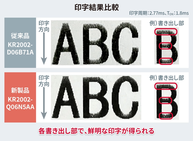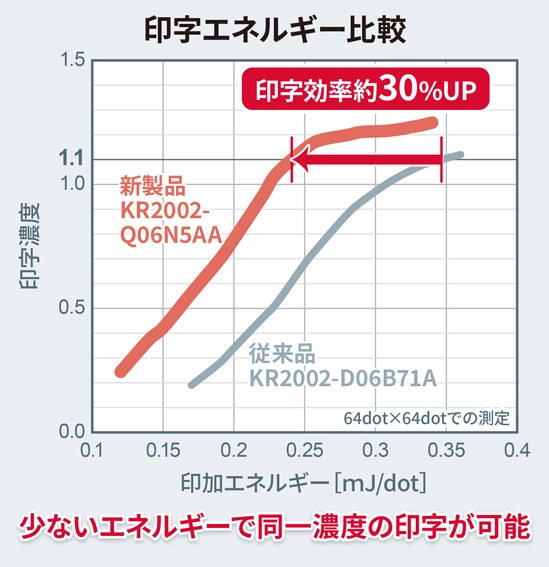 これらの改善により、リチウムイオン電池2セル(7.2V)駆動タイプの従来品と同等の印字速度と印字画質をリチウムイオン電池1セルで実現しました。また1セル駆動サーマルプリントヘッドの従来品に対して、印字に必要な印加エネルギーを約30%削減することに成功しました。これらの特長から、新製品はサーマルプリンタ機器の小型・軽量化と省エネ化に貢献します。