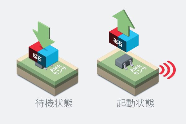 例えば電子機器に搭載されたAMRセンサが磁石と近接しているときは機器がスリープ状態になり、磁石の離脱を検知すると起動状態になります。
