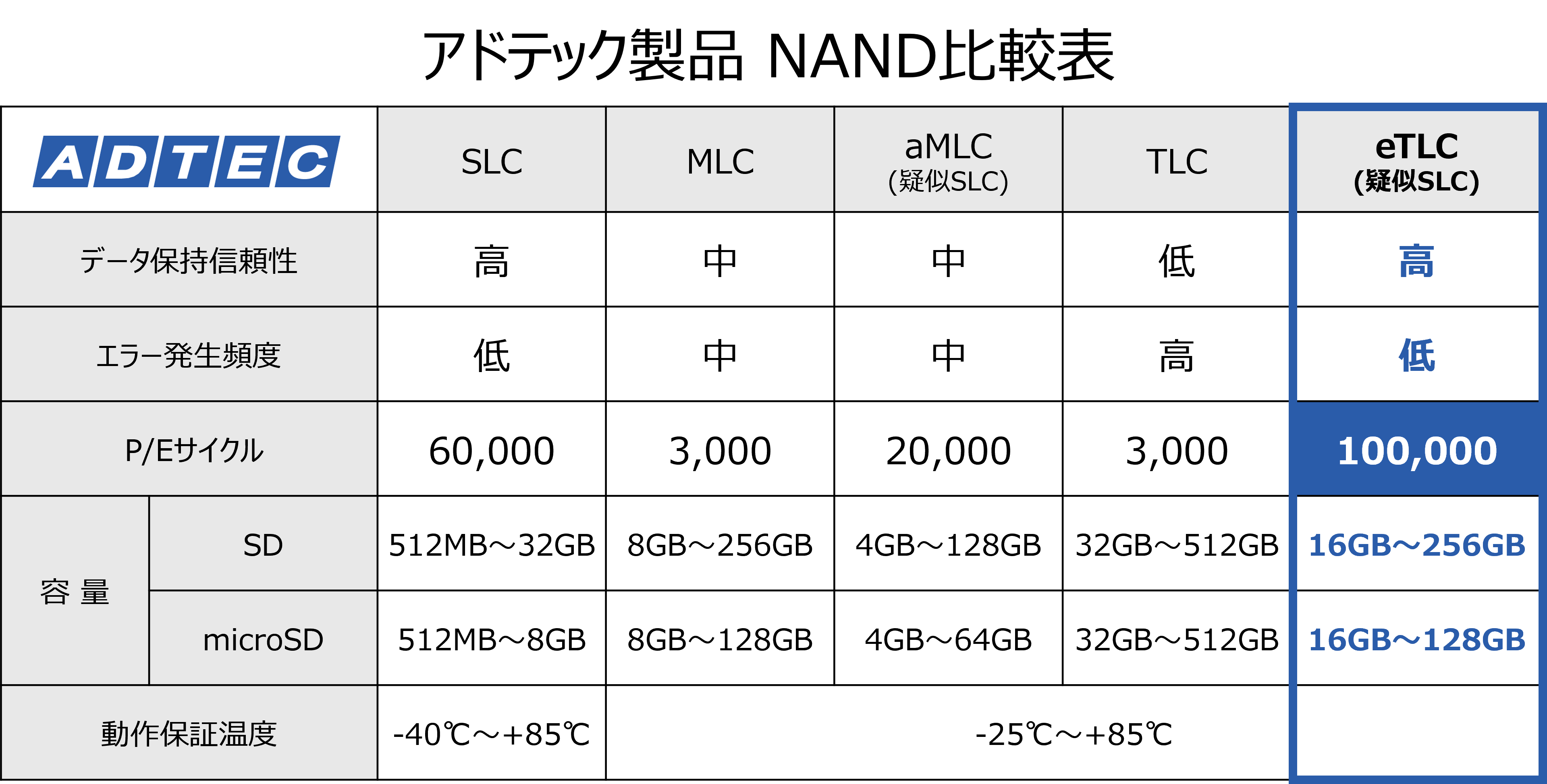TLCベースでありながらSLCと同等レベルのデータ保持信頼性を実現し、さらにP/Eサイクルを大幅に向上したeTLC(expansion TLC)タイプの「産業用SD」と「産業用microSD」です。