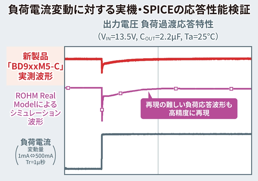 新製品の検証用シミュレーションモデルでは、ローム独自のモデルベース技術を駆使して、IC実物の電気的特性と温度特性を忠実に再現することで、IC実物とシミュレーション値の完全一致も可能にする高精度SPICEモデル「ROHM Real Model」を完備。確実な検証により、実機試作後の手戻りを防止できるなど、効率的なアプリケーション開発に貢献します。