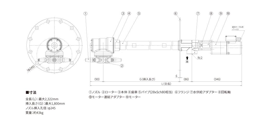 電動モーター駆動による安定した低速回転、および『RJ3-MD』『RJ3-MD-L』と比べ約10倍の水量を噴射することで高い洗浄力を発揮します。飛距離も2倍以上に伸びたことで、大容量タンクの洗浄に最適な製品となりました。